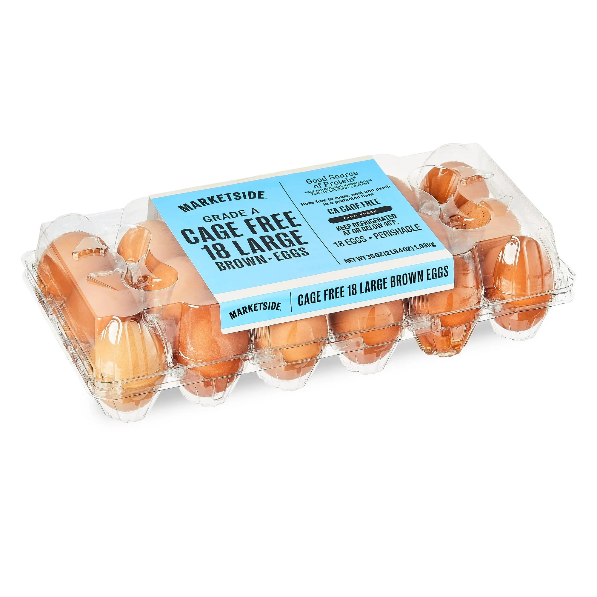 Keep a versatile, everyday recipe ingredient on hand with our Marketside Cage Free Large Brown Eggs, 18 Count in a PET Plastic Recyclable Carton. Our eggs come from hens that are free to roam, nest, and perch in a protected barn. Eggs are an excellent source of protein, as well as vitamin B5 and selenium, which are essential for a healthy diet. Use our eggs to create a variety of baked goods such as bread, fluffy pastries, cookies, cakes, and more. Make a delightful low-carb treat by baking one egg into half an avocado for a dose of healthy fats. When you want a quality product at a great price, choose Marketside Cage Free Large Brown Eggs. Fresh ideas and quality ingredients, that’s how Marketside brings the best foods to your table. We are committed to deliver freshness that you can taste and see. Marketside offers the best in fresh food, guaranteed by Walmart, working in partnership with farmers, bakers and chefs for the highest quality, authentic ingredients and favorite recipes.